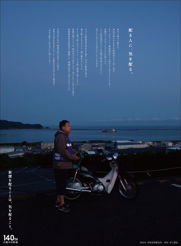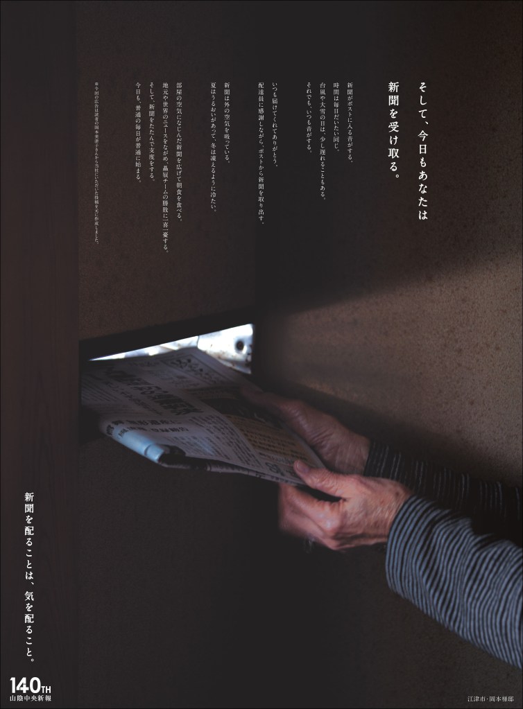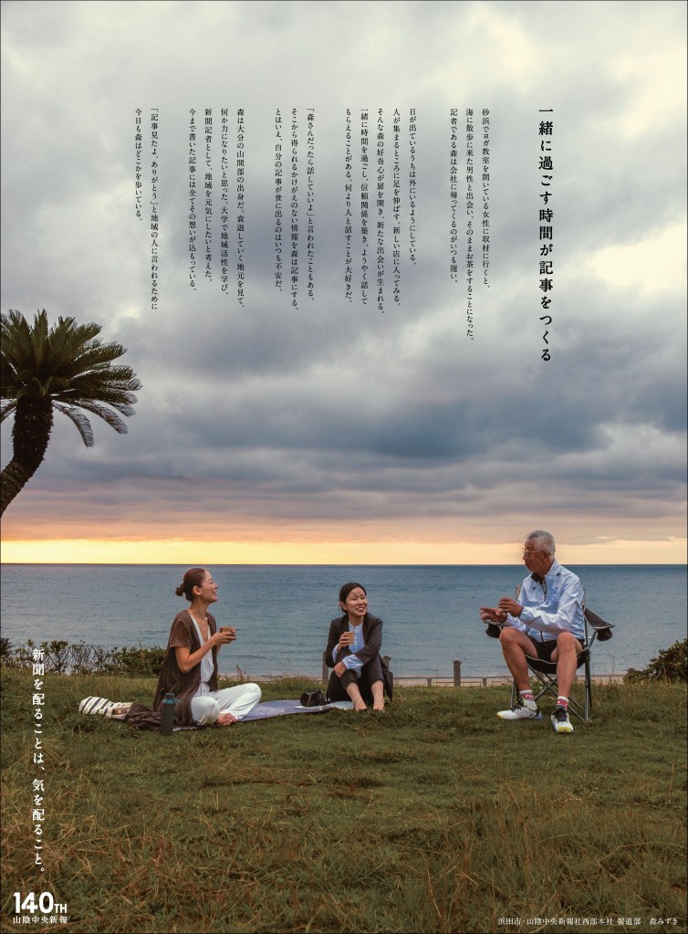 島根県の新聞社、山陰中央新報の140周年のキャンペーンです。新聞原稿のシリーズと動画を制作。クリエイティブディレクター、コピーライター、カメラマンとして、半年にわたって島根県中を駆け巡りました。