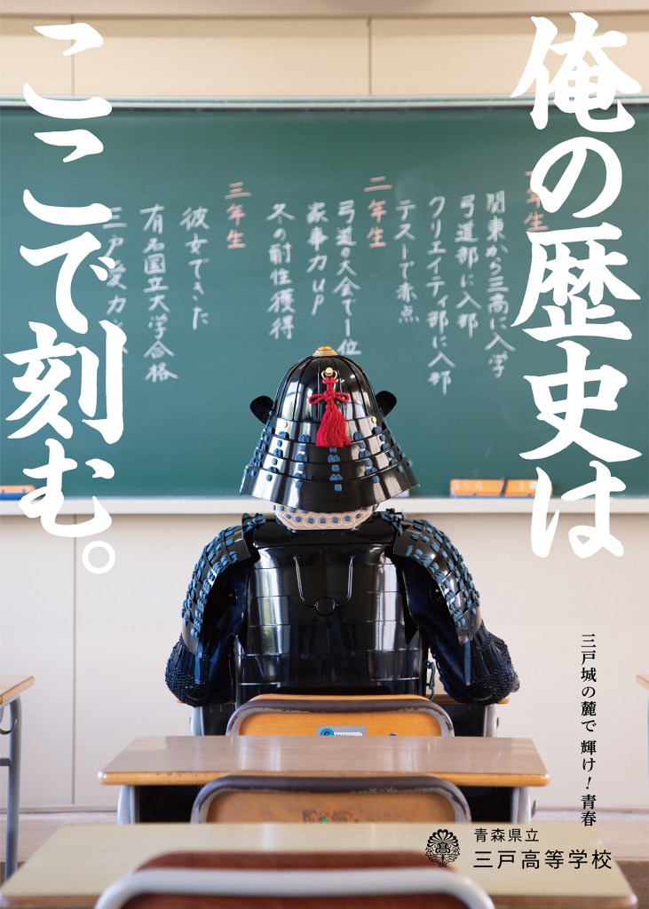 生徒数の減少により、全国募集に踏み切った青森県立三戸高等学校。高校魅力化のために、クリエイティビティで地域課題を解決する授業カリキュラムの作成&授業と、『クリエイティ部』という部活動を行っています。具体的には、三戸町と高校PRのための、ポスター、動画、パンフレットづくり。商品パッケージ作成、居場所づくりなど。青森JAGDAのメンバーなど地元青森のクリエイターと協働して行っています。